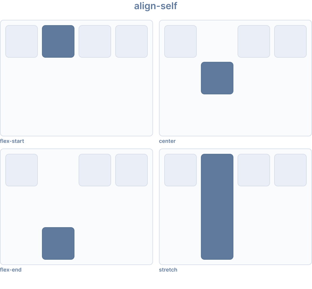 align-self CSS プロパティは、グリッドまたは flex アイテムの align-items 値をオーバーライドします。グリッドでは、グリッド領域内でアイテムを配置します。flexbox では、交差軸上でアイテムを配置します。